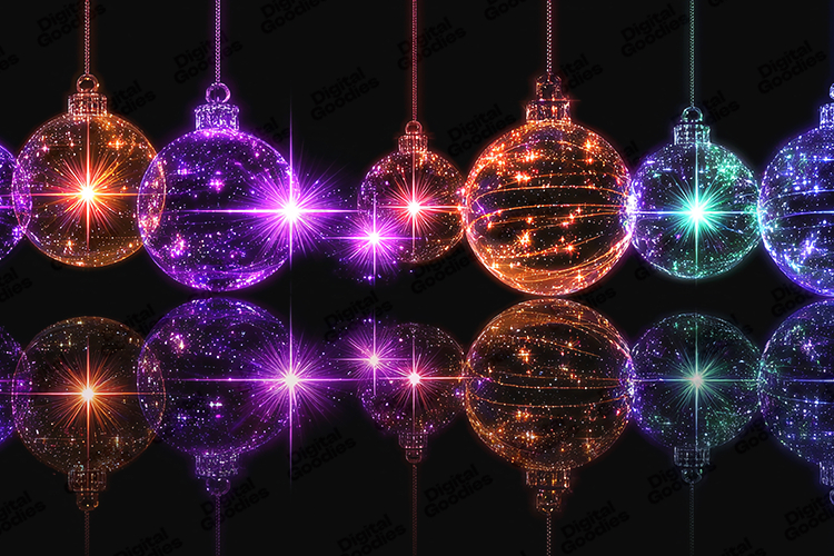 A stunning glowing neon Christmas ornament background featuring vibrant purple, orange, aqua, and blue baubles with sparkling star effects and reflective shine. Perfect for modern holiday cards, posters, invitations, digital art, sublimation projects, festive branding, and luxurious Christmas designs. This bright and colorful artwork creates a magical glowing holiday atmosphere.