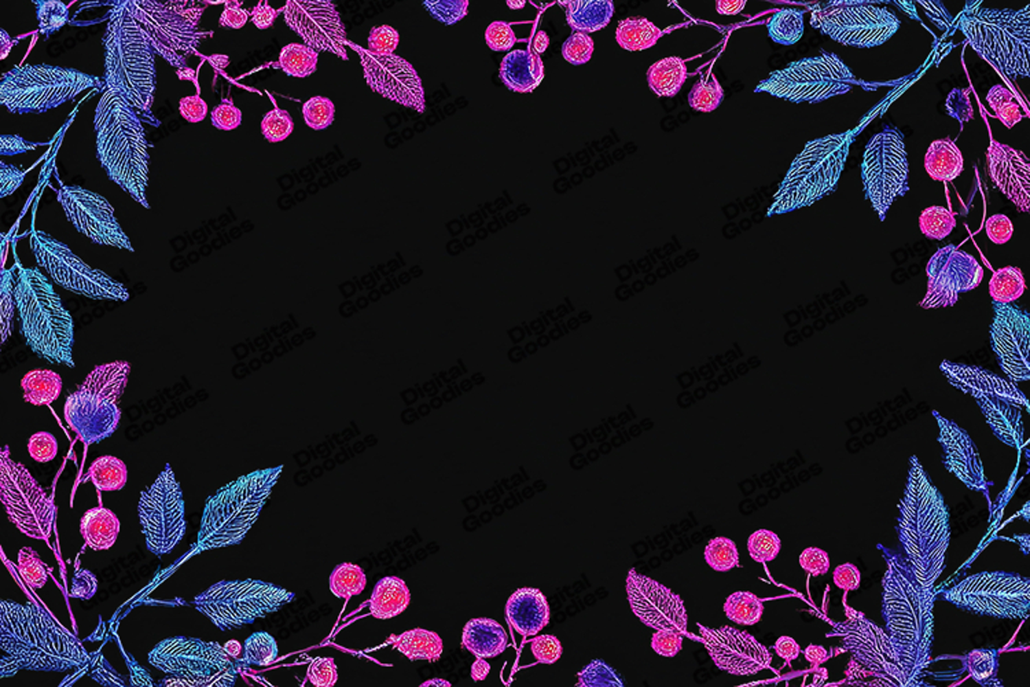 A striking neon botanical border featuring glowing leaves, delicate branches, and vibrant berries in vivid shades of blue, pink, and purple. Set against a deep black backdrop, the illuminated floral elements create a bold and elegant frame perfect for invitations, greeting cards, posters, digital art, and decorative design projects. This high-quality background adds a modern, luminous, and eye-catching aesthetic to any creative work.