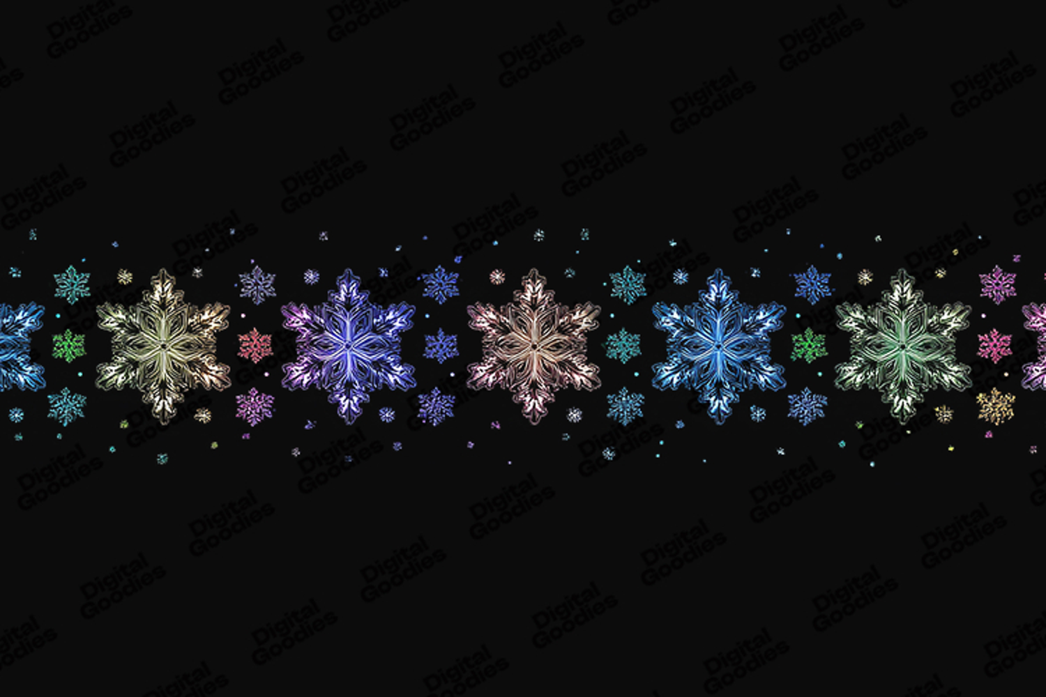 A vibrant neon snowflake border pattern featuring colorful glowing snowflakes on a dark background. Perfect for winter crafts, Christmas cards, festive invitations, borders, digital scrapbooking, and holiday-themed designs.
