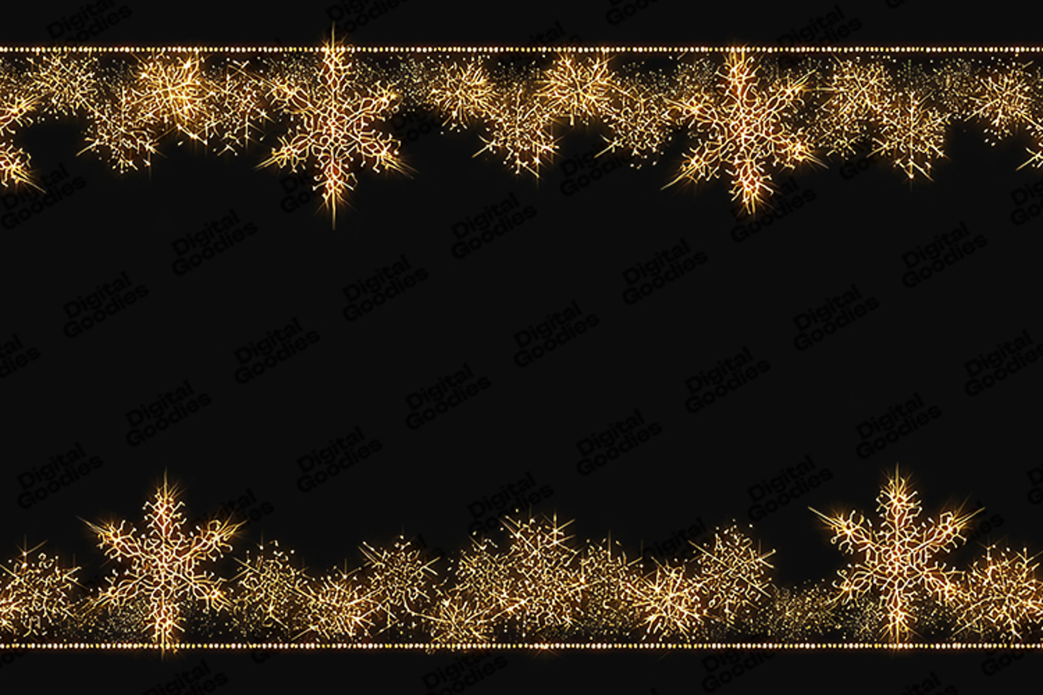 A luxurious gold glowing snowflake border design on a dark background, perfect for Christmas cards, winter invitations, festive frames, digital scrapbooking, and holiday design projects. Ideal for adding elegant sparkle to seasonal creations.