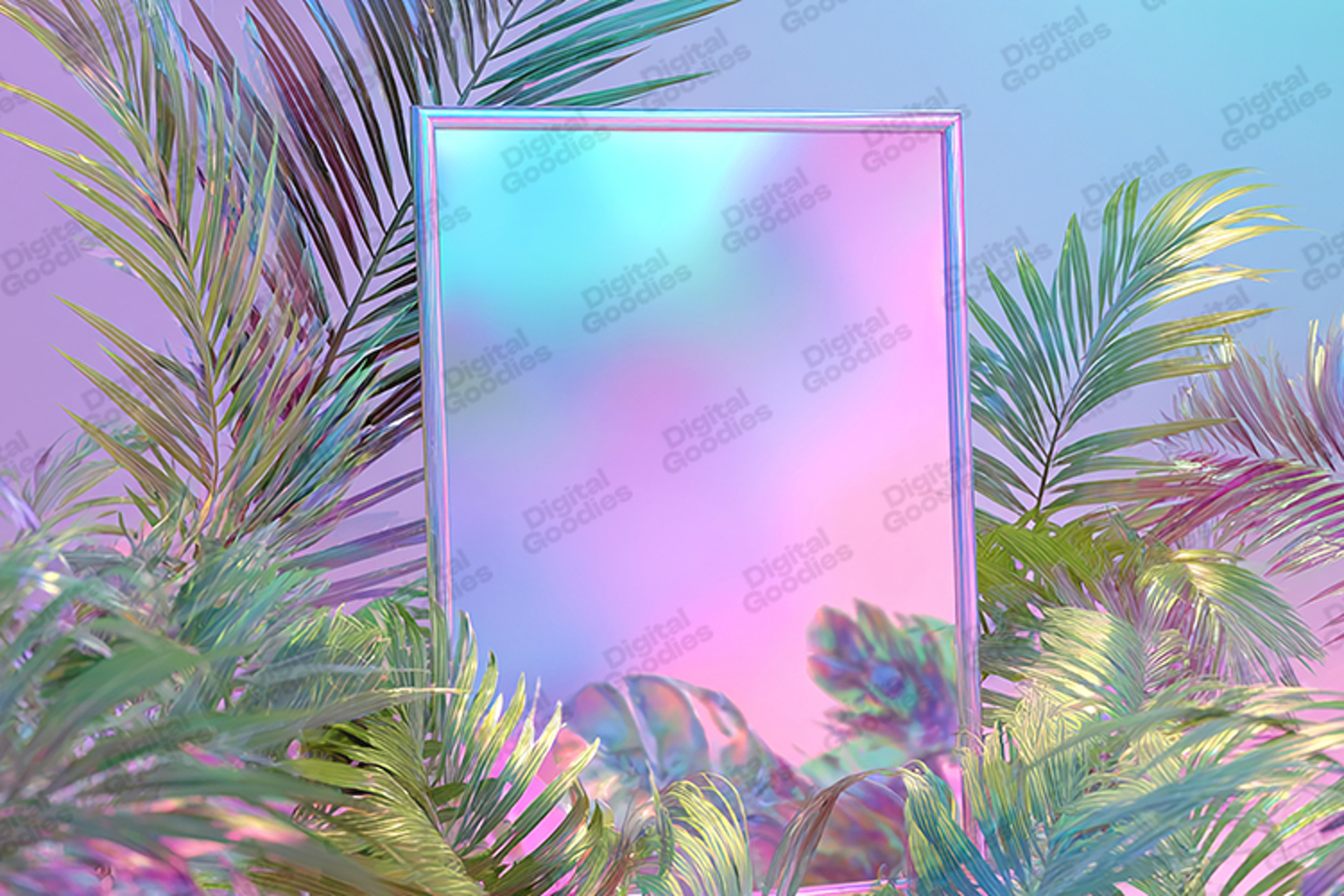 A dreamy holographic background featuring a pastel gradient frame surrounded by tropical palm leaves. Perfect for creative projects, digital papers, mockups, invitations, branding, aesthetic artwork, and modern design layouts. This soft, colorful tropical scene adds elegance, freshness, and a stylish visual touch to any creative project.