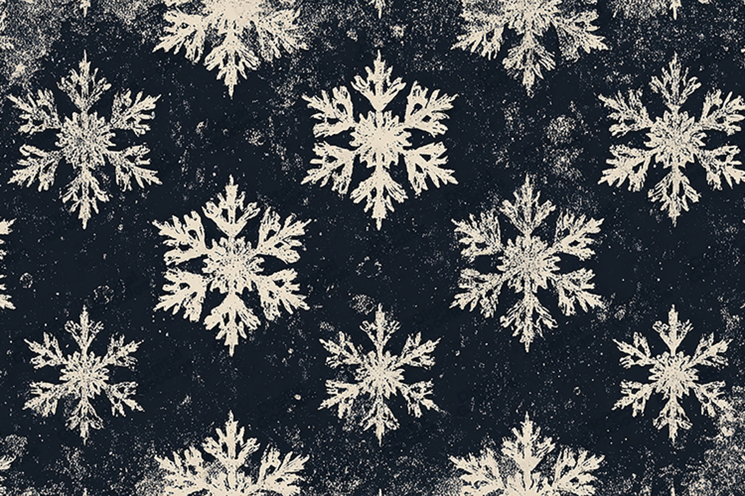 A bold and high-contrast winter pattern featuring large, distressed white snowflakes repeating against a heavily textured, dark grunge background (deep navy or black). The vintage, rough aesthetic gives this pattern a striking, modern edge. This versatile digital paper is excellent for creating unique wrapping paper, fabric prints, grunge holiday graphics, sublimation designs, and any project that needs a strong, textured, and contemporary seasonal background.