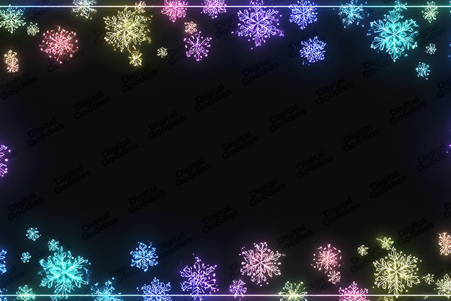 A glowing neon snowflake background featuring colorful illuminated snowflakes arranged around a dark center frame. Perfect for winter crafts, holiday cards, sublimation printing, invitations, scrapbooking, and festive digital design projects. This vibrant frosty frame adds a modern, bright, and magical seasonal touch to any creative artwork.