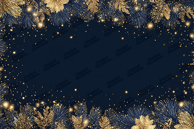A luxurious blue and gold Christmas background featuring sparkling pine branches, glittering leaves, and a glowing festive border. Perfect for holiday cards, invitations, banners, sublimation, scrapbooking, social media graphics, and winter-themed creative projects. The elegant glitter frame adds a premium holiday feel, ideal for both print and digital use.