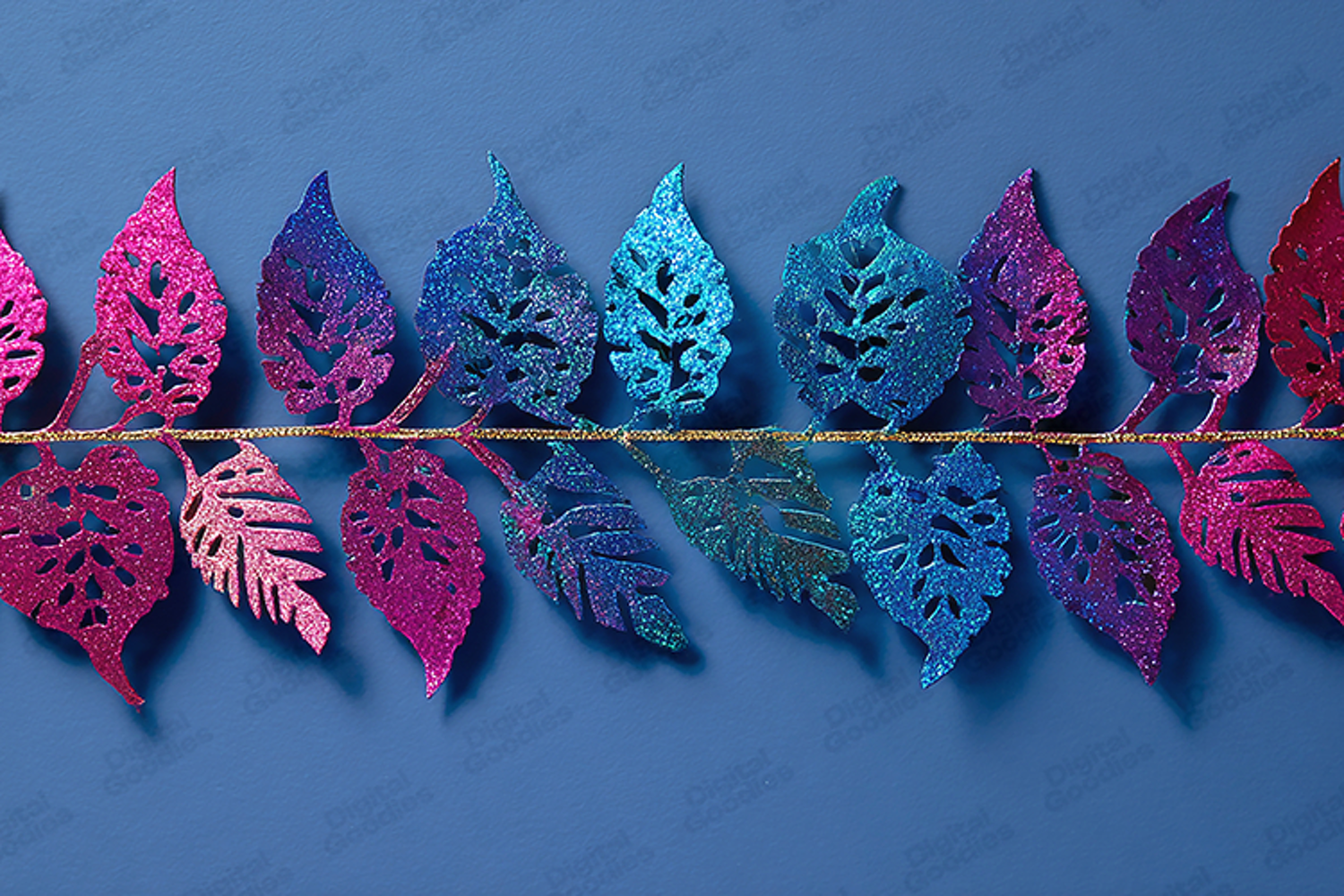 This eye-catching image features a decorative horizontal garland composed of stylized, cutout leaves covered in vibrant, chunky glitter. The garland showcases a brilliant color transition from intense pink and magenta on the sides to rich blue and teal in the center, set against a smooth blue background. This high-resolution photo is ideal for creating festive invitations, party printables, banner headers, vibrant digital papers, or adding a fun, high-impact, and celebratory decorative element to any craft or digital design project.