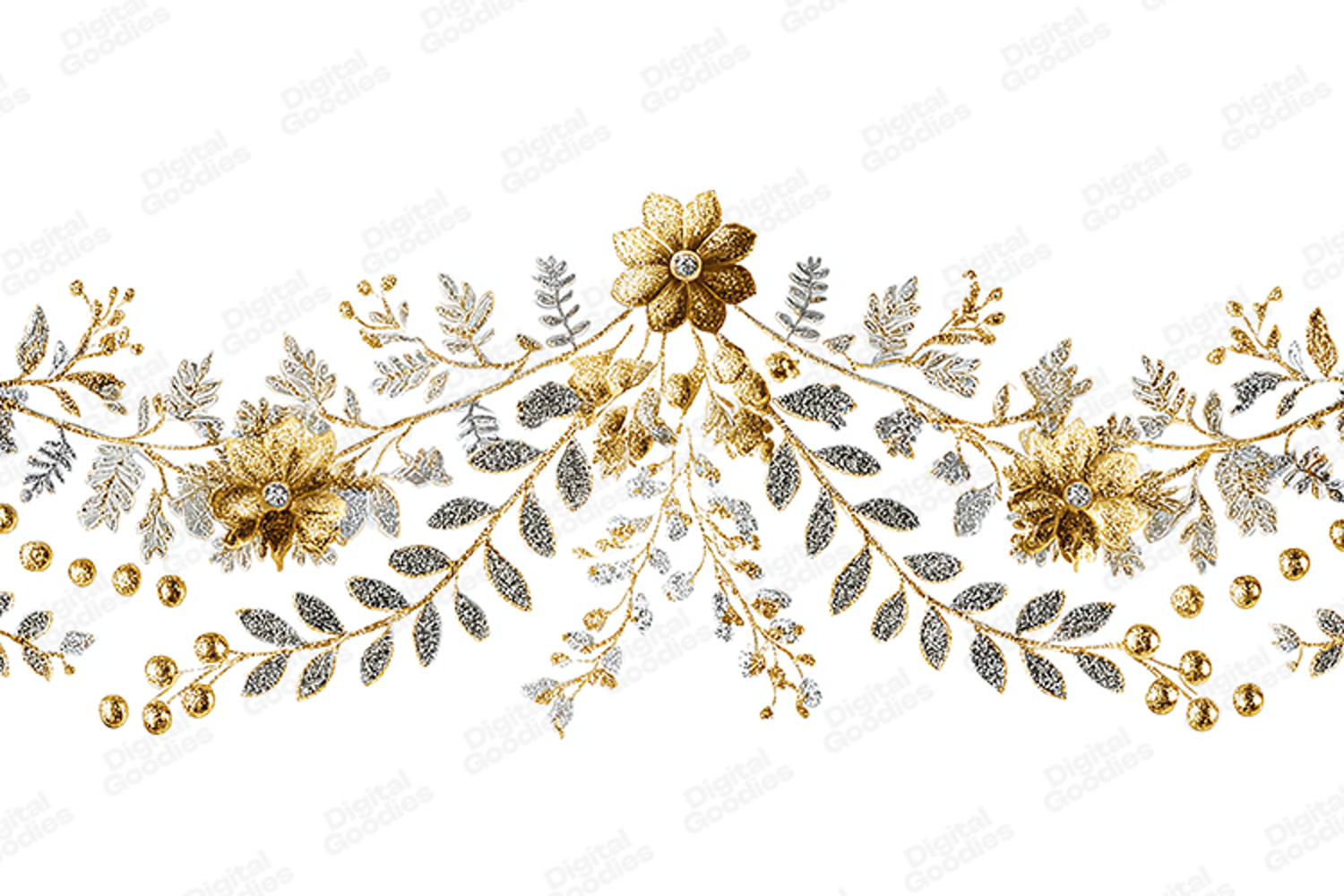 A stunning, high-resolution digital image featuring a central horizontal border of intricate leaves and flowers rendered in dazzling gold and silver glitter. Adorned with metallic berries and set against a clean white background, this elegant design is perfect for formal stationery. Ideal for wedding invitations, anniversary announcements, sophisticated holiday greeting cards, product packaging, and luxurious sublimation prints.