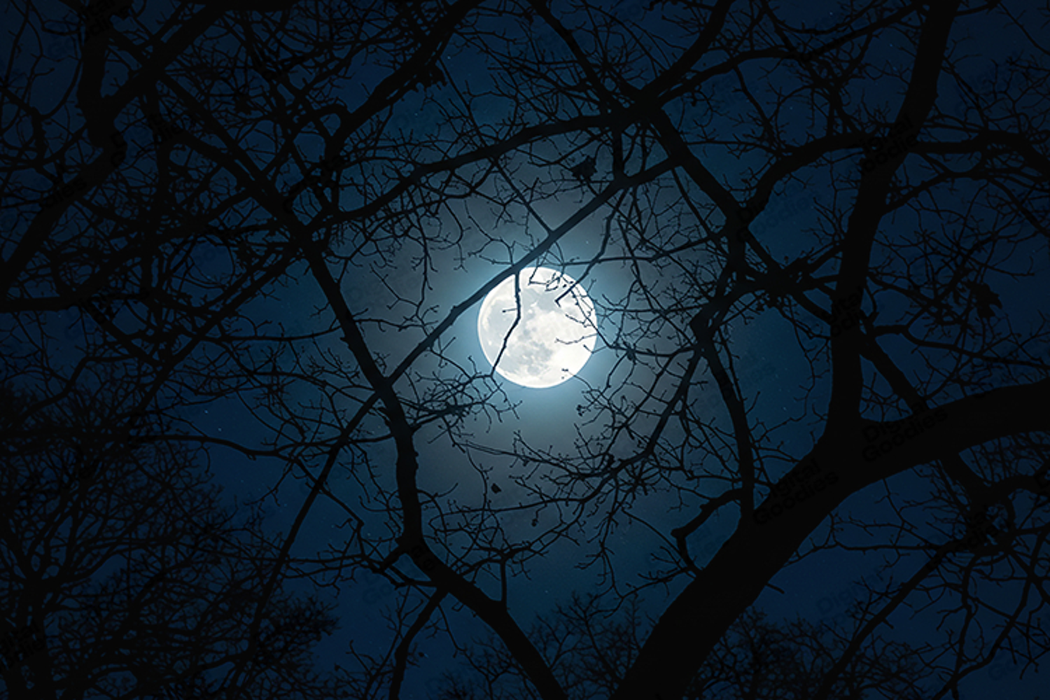 A captivating full moon glowing behind bare tree branches, creating a moody and atmospheric night scene. Perfect for dark aesthetic artwork, fantasy designs, Halloween themes, mystical posters, and nature-inspired digital projects. The dramatic moonlight and detailed silhouette trees add depth and mystery, making it ideal for backgrounds, book covers, and creative compositions.
