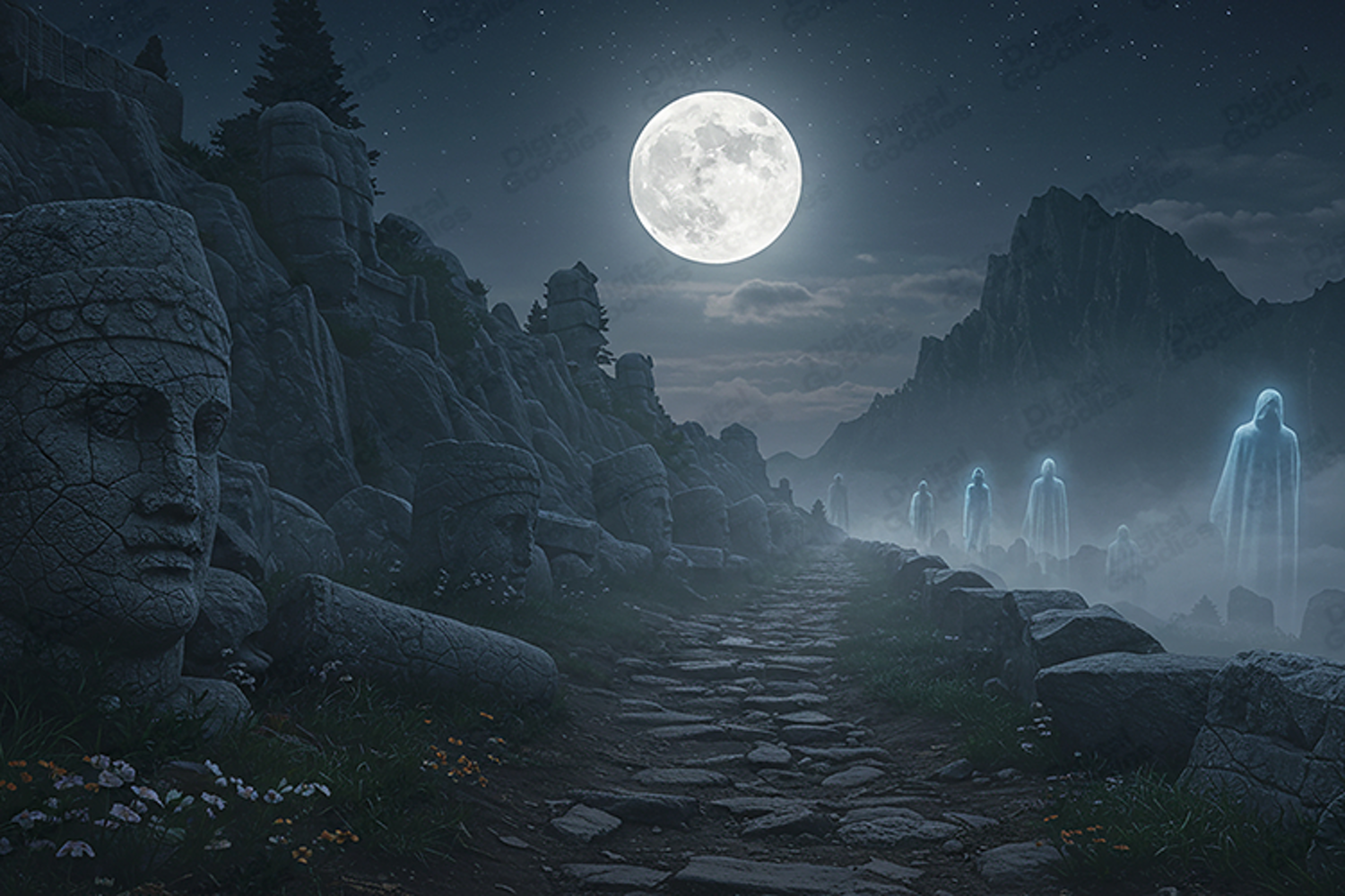 Mystical Moonlit Path with Ancient Statues and Ghostly Figur