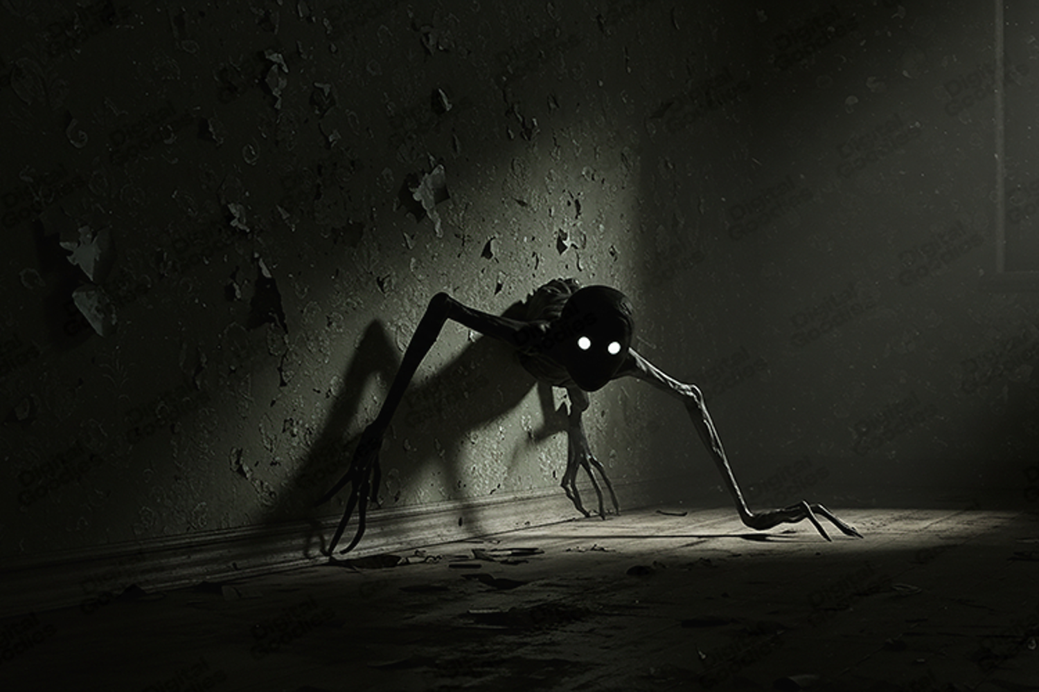 A terrifying creature crawling from the shadows in a decayed, abandoned room, illuminated only by its bright glowing eyes. This chilling horror scene is perfect for dark artwork, thriller posters, Halloween designs, spooky backgrounds, and atmospheric digital compositions. The cracked walls, dramatic shadows, and eerie cinematic lighting make it ideal for book covers, concept art, and any project needing intense horror energy.