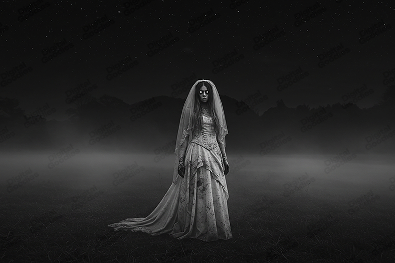 A haunting black-and-white horror background featuring a ghostly bride standing alone in a fog-covered night field. With glowing eyes, drifting mist, and a dark atmospheric landscape, this eerie scene is perfect for Halloween graphics, spooky artwork, digital crafting, posters, and storytelling visuals. Ideal for adding mystery, tension, and cinematic horror mood to any creative project.