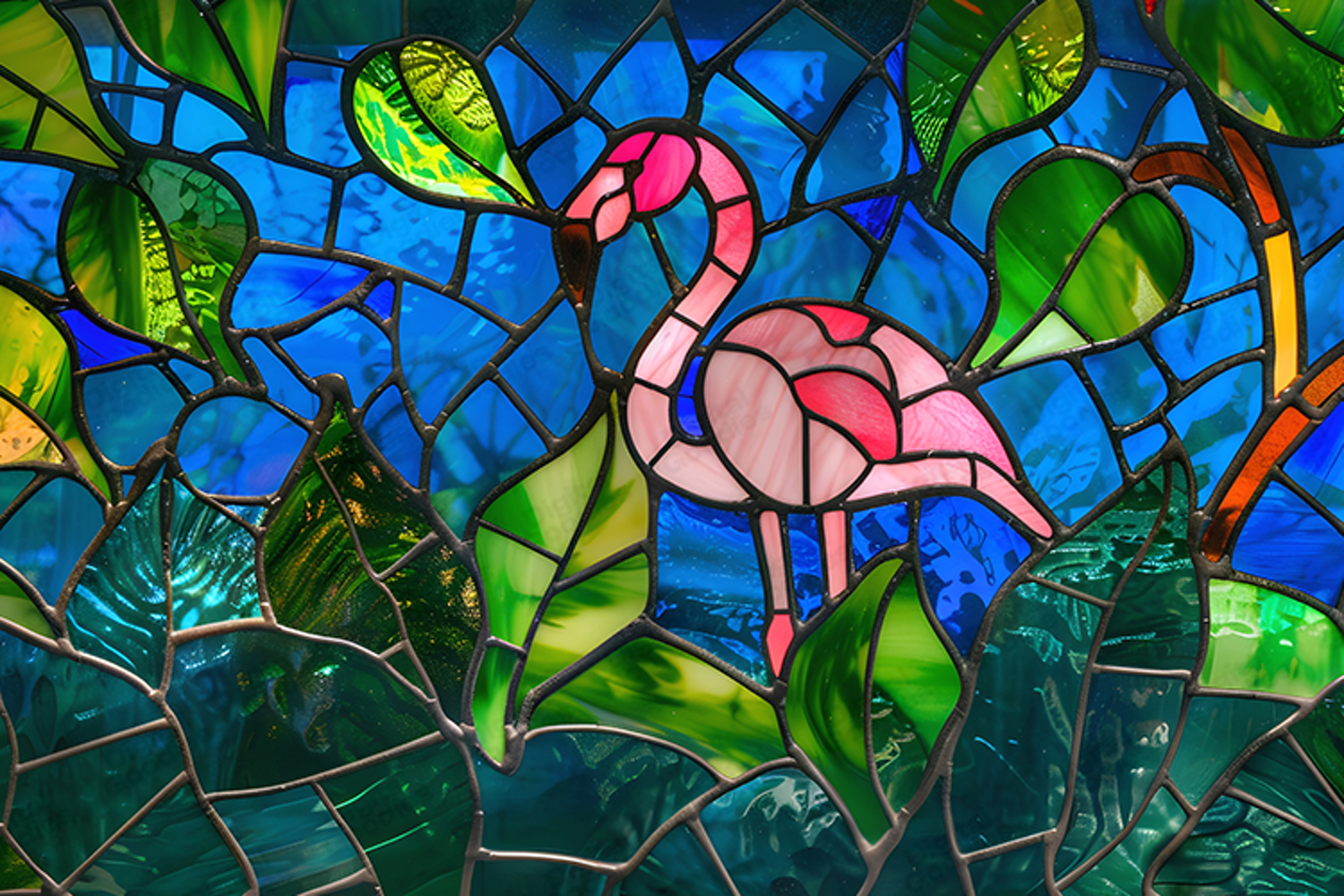 A dazzling digital background featuring an elegant pink flamingo surrounded by lush green and blue tropical foliage, all rendered in a detailed, leaded stained glass style. The design uses rich jewel tones, creating a vibrant, exotic, and luxurious aesthetic perfect for contemporary or Art Deco-inspired projects. This high-resolution file is ideal for creating unique summer invitations, resort-wear sublimation designs, vibrant wall art, or adding a stunning, tropical, and artistic element to any creative work.