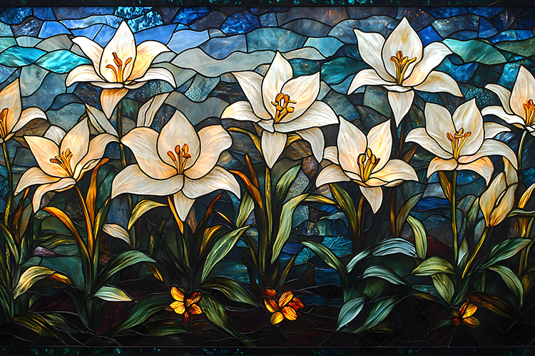 An elegant digital background featuring a row of luminous white lilies and green foliage set against a vibrant, patterned blue sky, all rendered in a classic stained glass style. The design emphasizes texture and light, capturing the beauty of a traditional Art Nouveau window. This high-resolution file is ideal for creating sophisticated wedding invitations, sympathy cards, peaceful home decor prints, sublimation designs, or adding a luxurious, calm, and detailed floral element to any creative project.