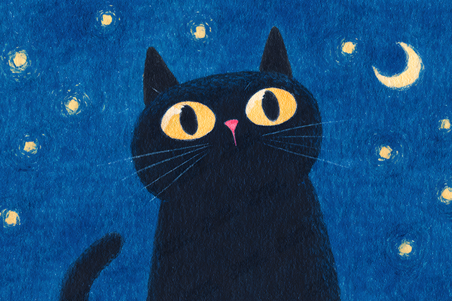 A delightful digital background featuring a stylized black cat with wide yellow eyes set against a deep blue, textured night sky filled with sparkling stars and a crescent moon. Rendered with a charming watercolor/gouache feel, this high-resolution file is perfect for creating adorable greeting cards, nursery decor, children's book illustrations, sublimation prints, and unique stationery. The whimsical and cozy aesthetic is sure to bring joy to any creative project.