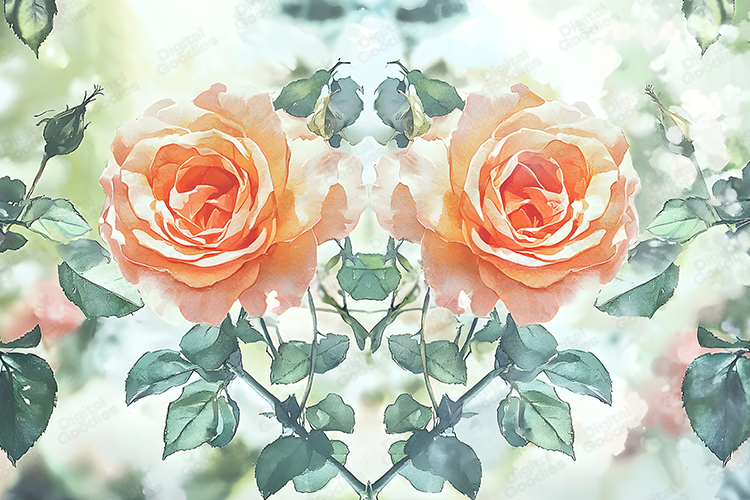 A beautiful mirrored watercolor rose background featuring soft peach and coral blooms surrounded by delicate greenery and a dreamy garden atmosphere. Perfect for invitations, greeting cards, stationery, wall art, scrapbooking, branding, and creative design projects. This elegant floral artwork adds a romantic, serene, and artistic touch to any creation.