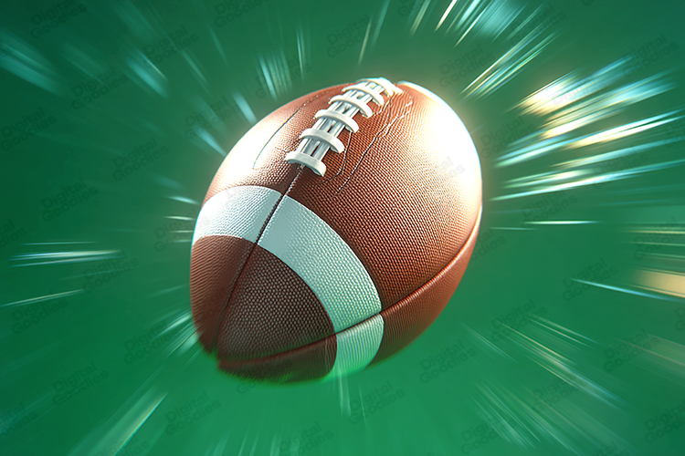 A dynamic sports background featuring a close-up football flying through the air with bright motion streaks and energetic lighting effects on a vibrant green backdrop. Perfect for sports posters, event graphics, team designs, digital papers, social media banners, and creative athletic projects. This high-impact football artwork adds excitement, energy, and bold action to any design.