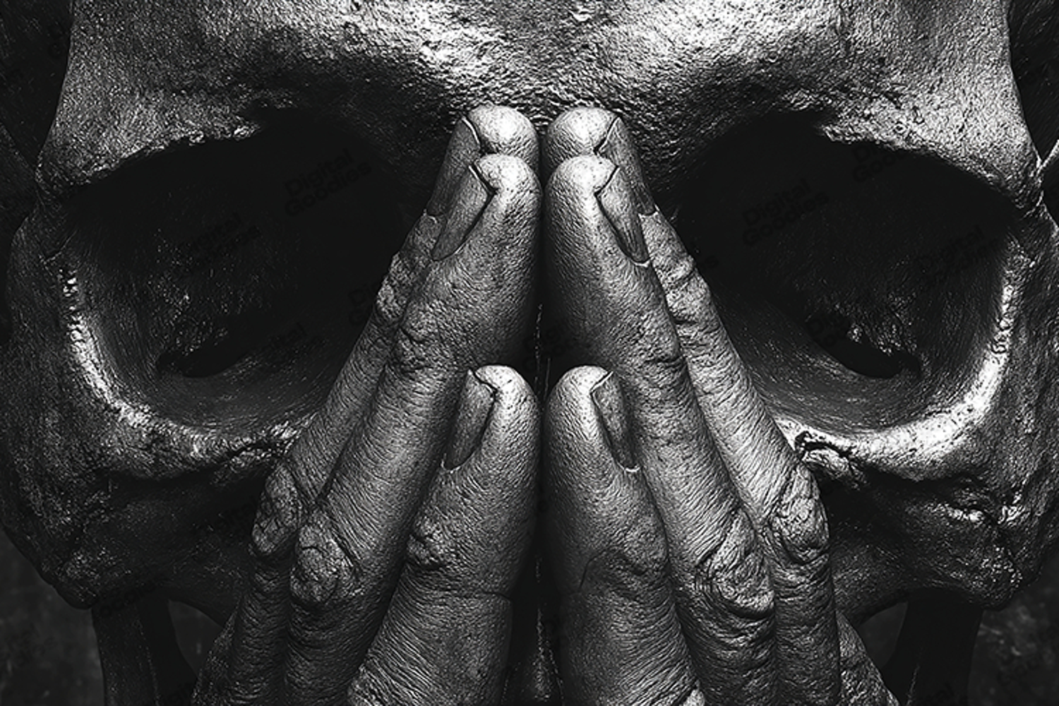 A dramatic monochrome horror-themed background featuring a skull with hands pressed together, creating an intense and eerie atmosphere. Perfect for Halloween designs, gothic artwork, posters, digital papers, album covers, and sublimation projects. This detailed skull design adds a dark, haunting, and visually striking impact to any creative project.