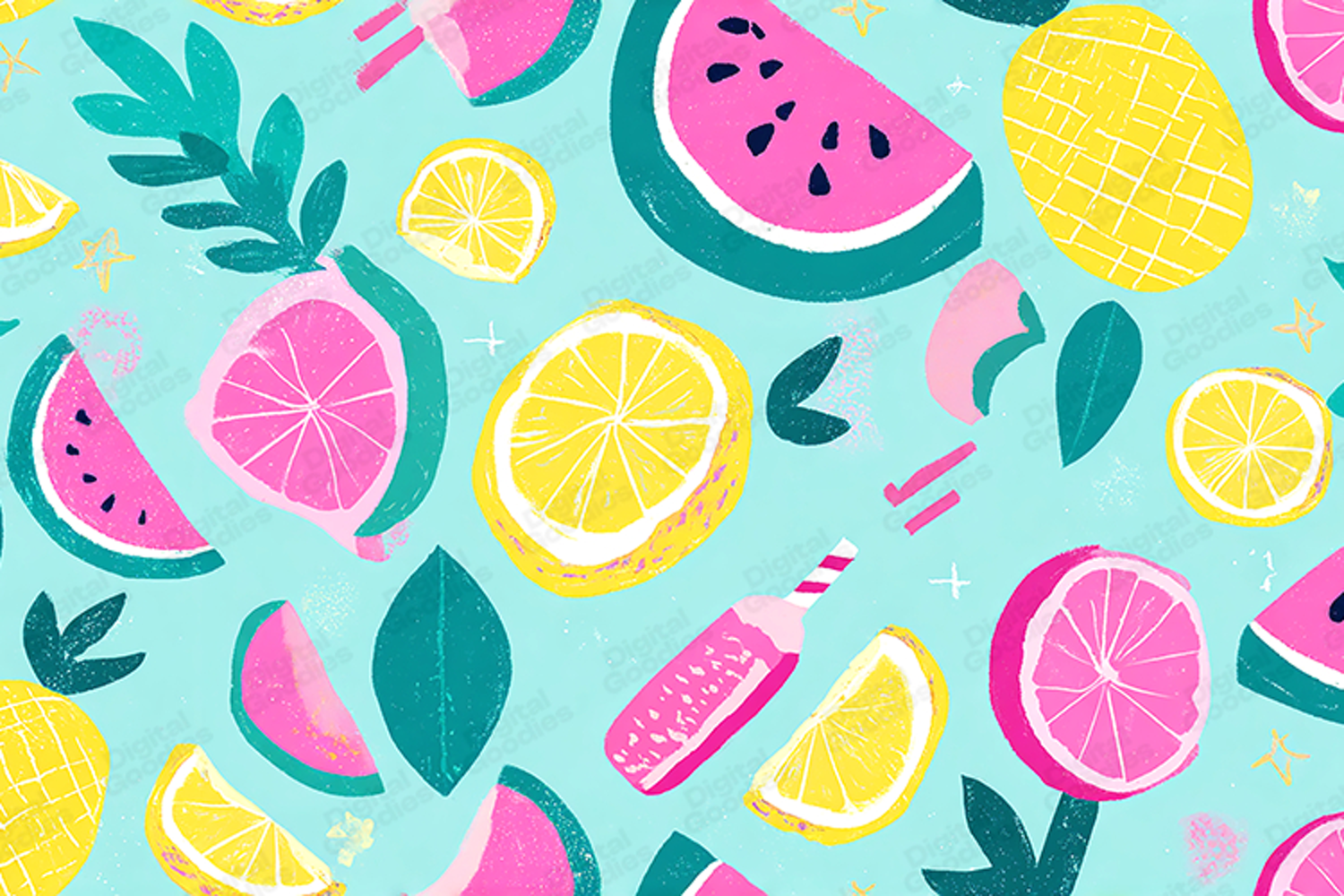 A vibrant summer fruit pattern featuring playful illustrations of lemons, watermelon, pineapple, leaves, and refreshing drink elements in bold retro colors. Perfect for digital papers, scrapbooking, invitations, kids’ projects, sublimation printing, and fun decorative designs. This cheerful tropical background adds freshness, color, and joyful energy to any creative project.