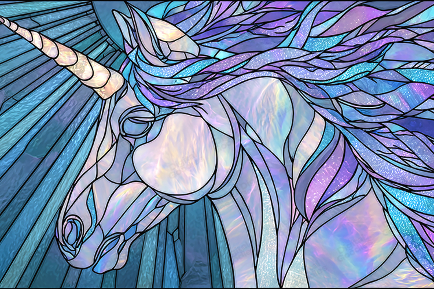 A stunning stained-glass style unicorn artwork featuring iridescent pastel textures, flowing decorative lines, and luminous glass-like details. Perfect for posters, digital papers, invitations, sublimation printing, scrapbooking, and fantasy-themed projects. This enchanting unicorn design adds elegance, magic, and a beautifully crafted stained-glass aesthetic to any creative project.