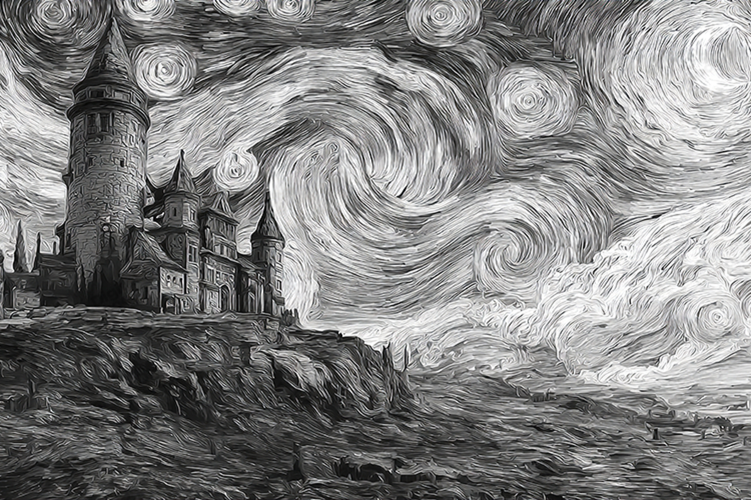 Black and White Fantasy Castle Swirling Sky Art example image 1