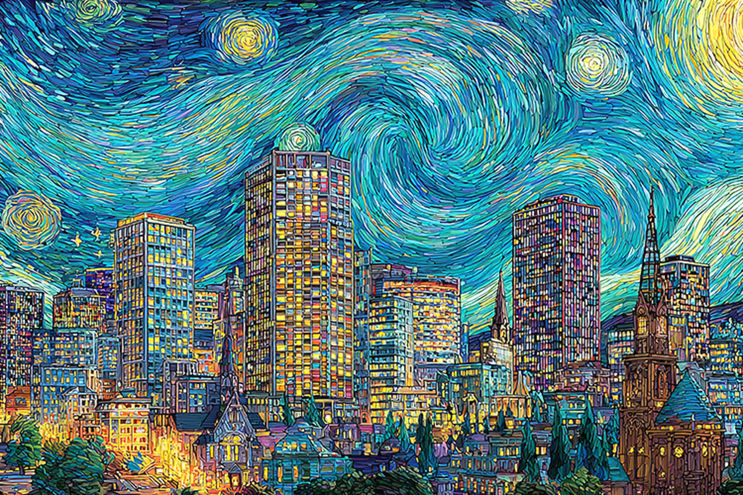 A vibrant cityscape illustration featuring glowing buildings beneath a dramatic swirling starry sky. The textured brushstroke style, rich colors, and expressive movement in the sky create a dynamic and artistic scene. Perfect for posters, digital prints, scrapbooking, creative projects, and modern design work. This high-resolution artwork adds energy, depth, and a captivating visual style to any project.