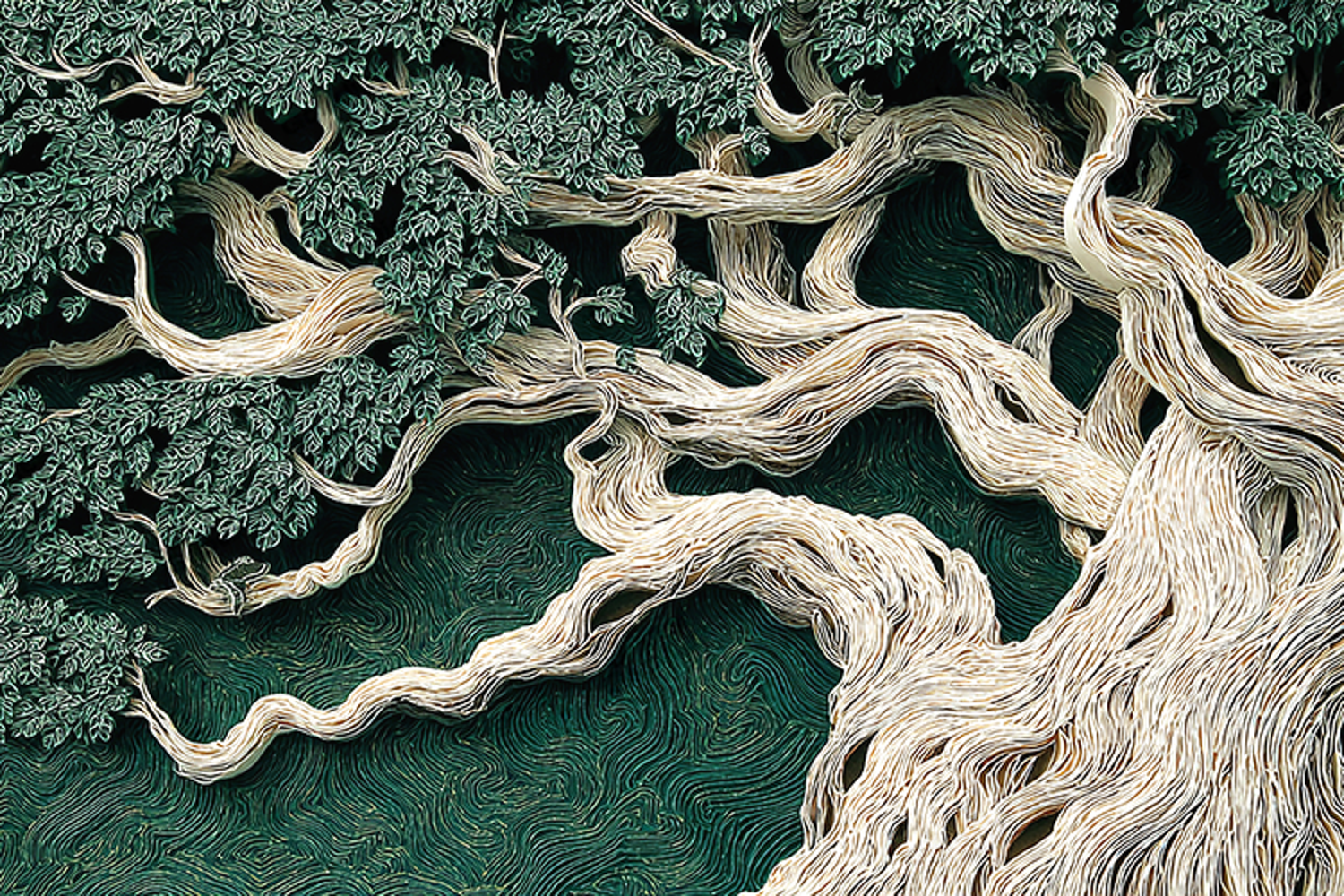 A richly detailed illustration featuring an intricate network of twisted tree trunks and flowing roots surrounded by lush foliage. The hand-carved, textured style creates a mesmerizing organic pattern perfect for wall art, posters, print projects, book covers, backgrounds, and nature-themed creative designs.