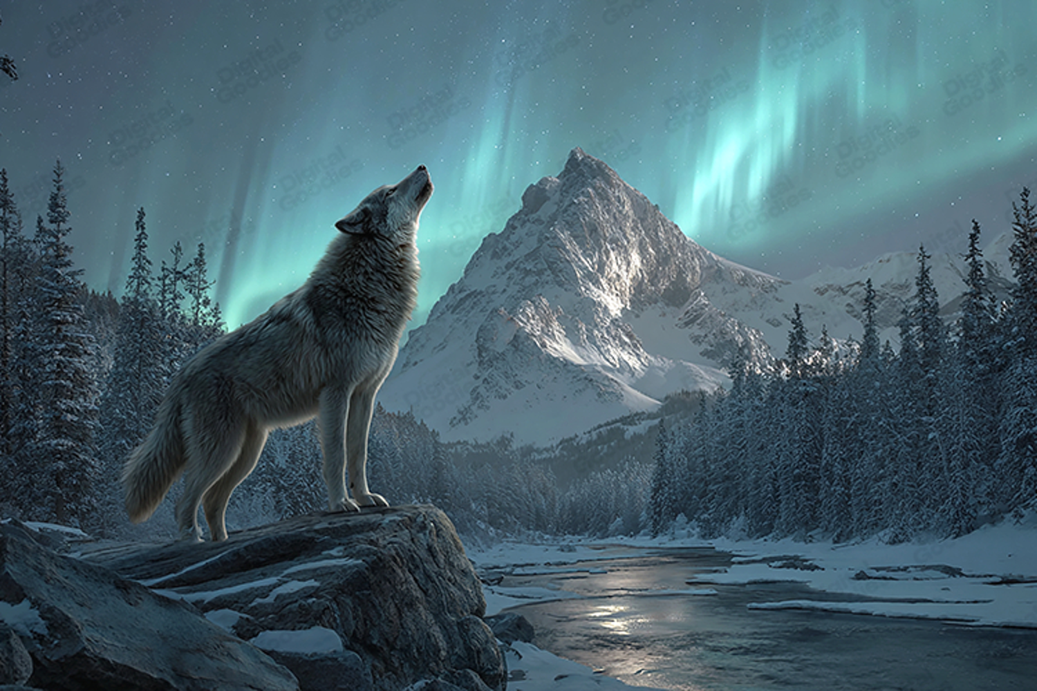 A powerful and atmospheric winter scene featuring a majestic wolf standing on a snowy cliff, howling beneath glowing northern lights. The icy river, tall pine forest, and towering mountain create a dramatic wilderness setting. Perfect for wall art, posters, digital prints, invitations, and creative projects that need a striking wildlife or fantasy nature aesthetic.