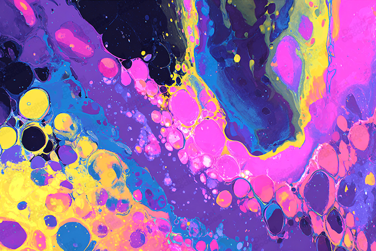 A bold and energetic neon fluid art background featuring vibrant splashes of pink, purple, yellow, and blue. The swirling liquid texture and organic bubble shapes create a dynamic, eye-catching design perfect for posters, art prints, product packaging, invitations, digital projects, and modern creative branding. Ideal for adding a striking and colorful abstract touch to any creative work.