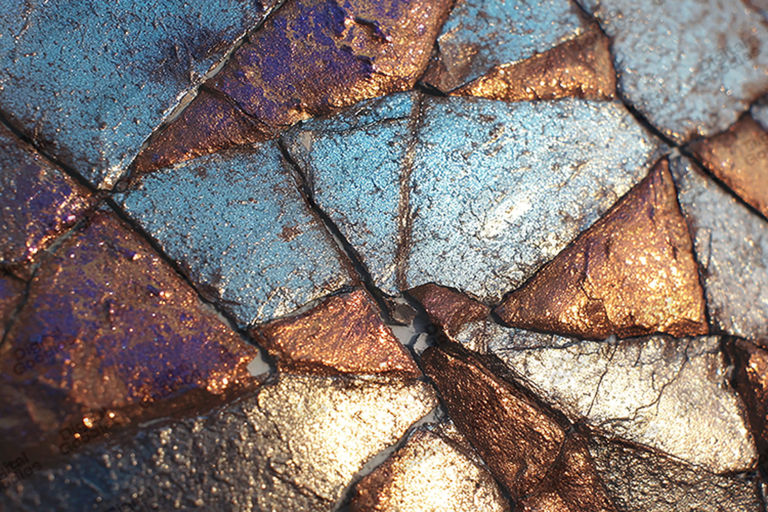 Geometric Digital Paper Shimmer Background Iridescent Texture Reflective Surface Cracked Pattern Metallic Mosaic Abstract Tile Blue Copper Bronze Silver