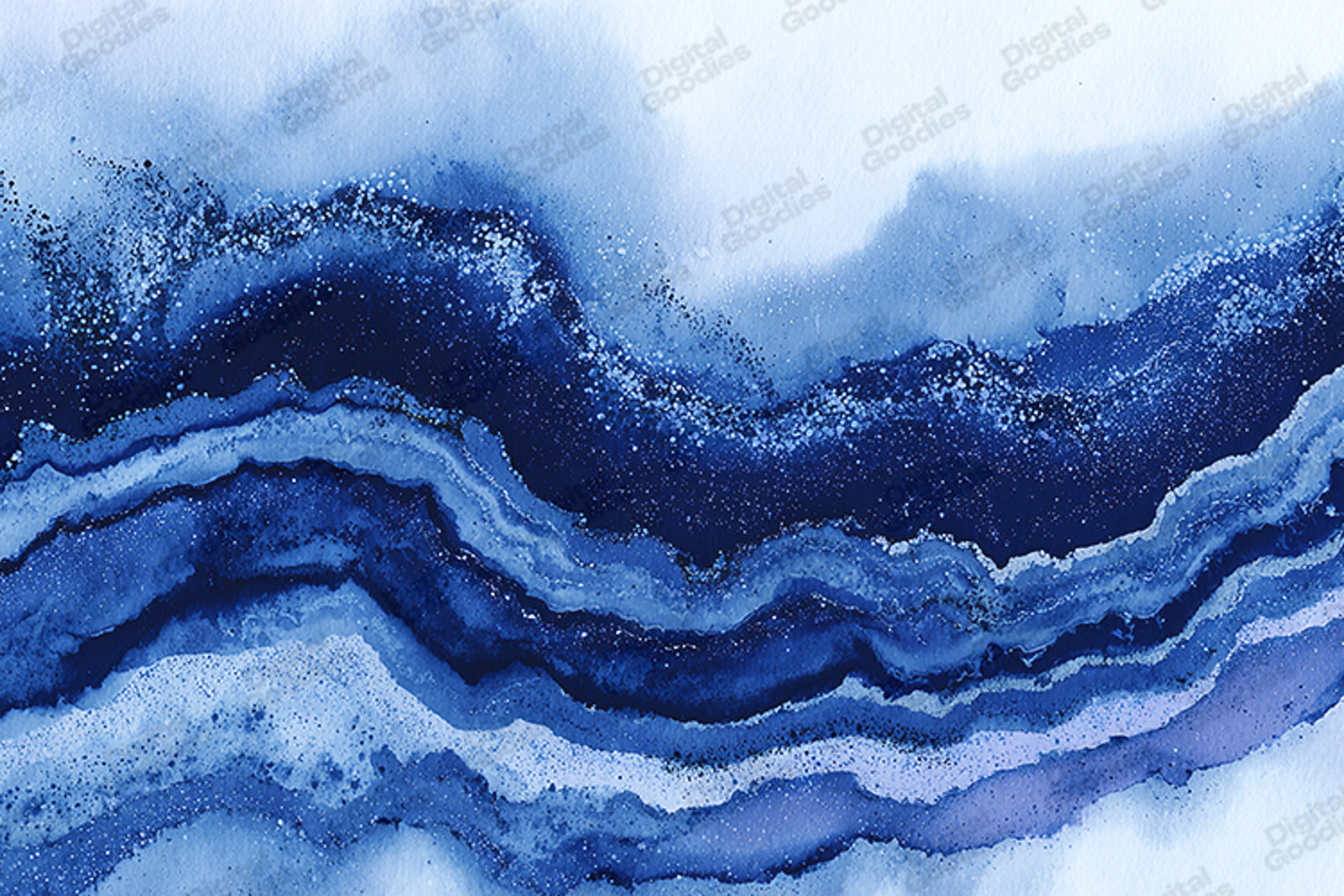 A magnificent, high-resolution watercolor texture featuring dynamic, wavy layers of intense blues and navy, highlighted by shimmering silver glitter. This abstract design captures the stunning, crystalline look of a sliced geode or an artistic, cosmic river flowing through space. The rich color depth and high contrast make it truly captivating. Ideal for luxury packaging, wedding stationery, sophisticated branding, sublimation products, digital scrapbooking, and creating unique, premium backgrounds.
