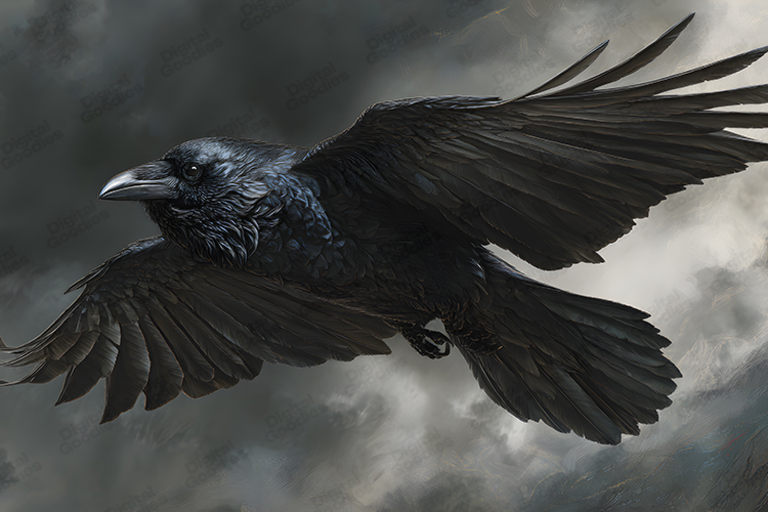 A dramatic and realistic artwork of a raven in flight, featuring detailed feathers, rich dark tones, and a moody storm-like sky. Perfect for digital papers, fantasy designs, and atmospheric creative projects. Ideal for card making, scrapbooking, sublimation printing, and artwork that needs a bold, mysterious, and visually striking bird illustration.