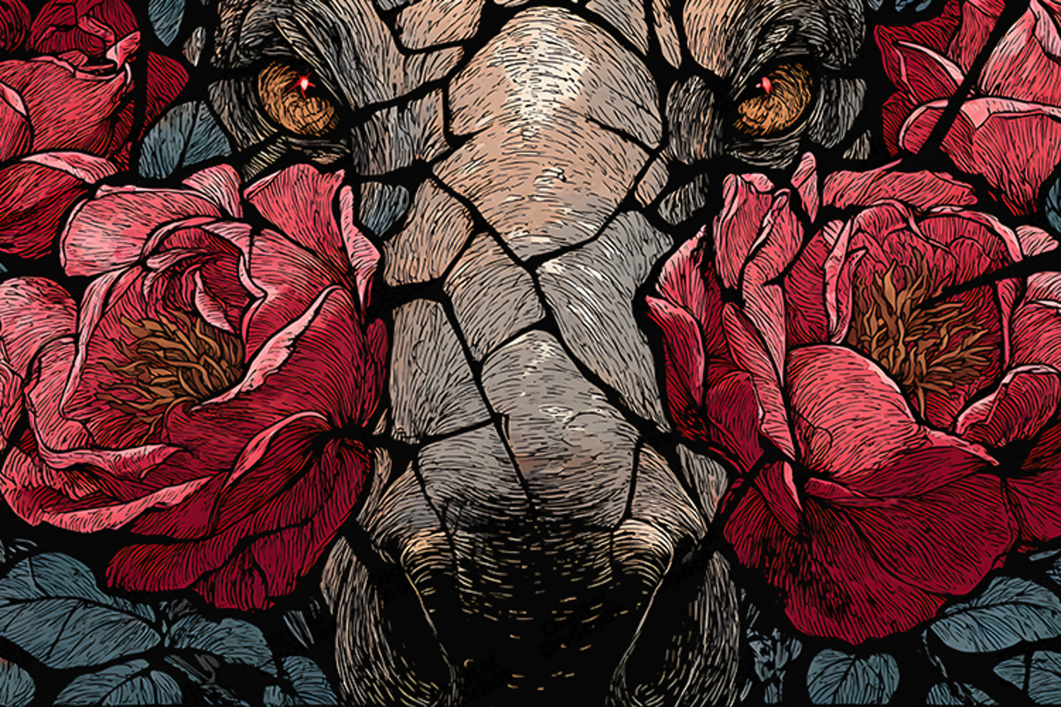 Detailed floral animal illustration featuring bold roses, intricate linework, and rich artistic shading, perfect for crafts, digital papers, and creative design projects. Ideal for scrapbooking, posters, apparel graphics, and decorative layouts, this expressive floral artwork adds depth, emotion, and a striking artistic flair to any creative project.