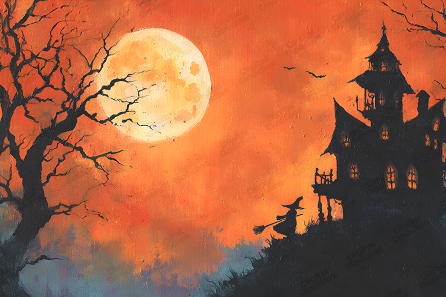 Moody Halloween artwork featuring a glowing full moon, haunted house silhouette, barren trees, and a witch flying across the night sky, perfect for crafts, digital papers, and spooky design projects. Ideal for scrapbooking, party invitations, posters, and creative layouts, this atmospheric Halloween texture adds mystery, drama, and a haunting seasonal charm to any project.