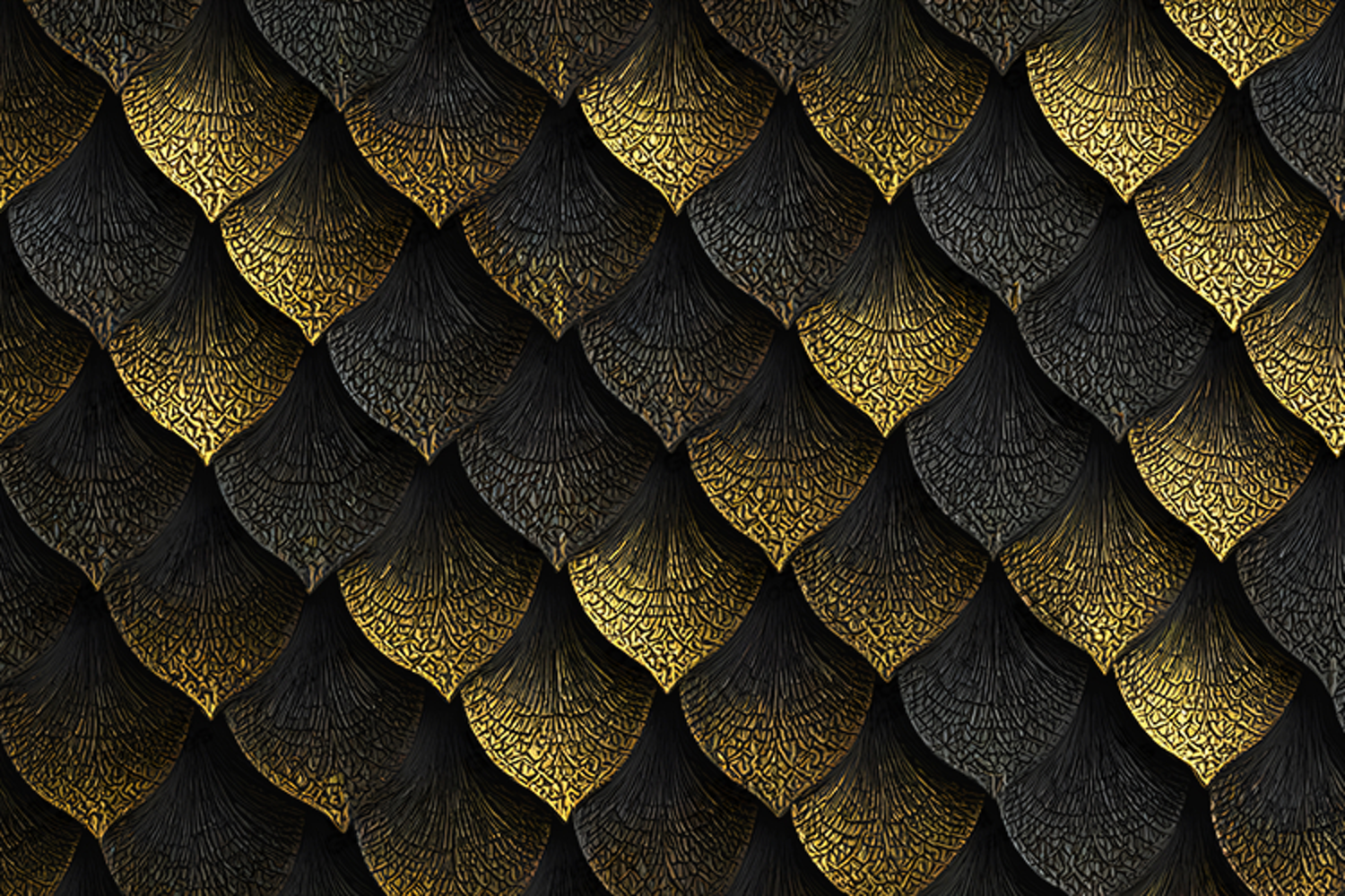 Opulent and dramatic black and gold scales texture featuring a highly detailed, repeating pattern with intricate etching on each scale. Perfect for fantasy crafts, bold digital papers, and dramatic designs. Ideal for scrapbooking, apparel, and sublimation printing, this striking black and gold pattern adds opulence, drama, and a highly detailed look to any creative project.