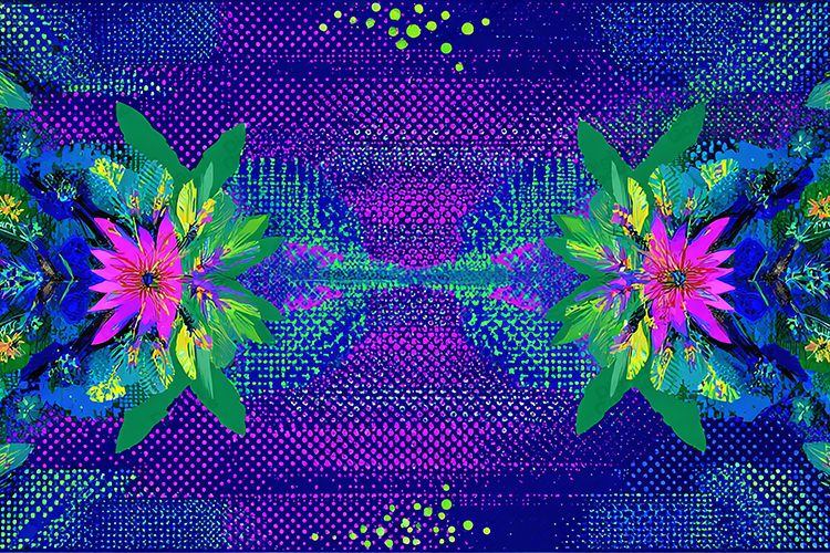 A high-energy, abstract digital pattern featuring a mirrored, kaleidoscopic design with striking neon floral elements and a vibrant dot-matrix texture. The color palette is bold and electrifying, dominated by deep blue, purple, magenta, and bright lime green. This unique and dynamic background is perfect for adding a retro, psychedelic, or futuristic touch. Ideal for textile printing, event flyers, digital paper, bold graphic design, and sublimation projects.