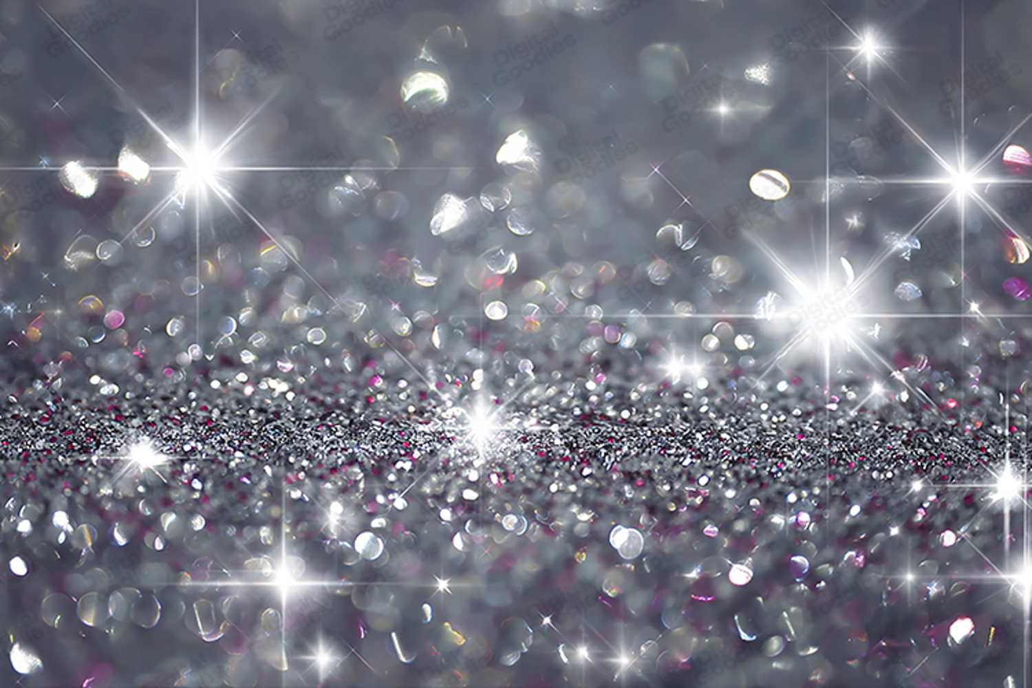Bright silver glitter background with glowing starbursts, shimmering lights, and soft bokeh sparkle. Perfect for festive designs, invitations, digital papers, luxury branding, party decor, and creative projects needing an elegant, glamorous shine.