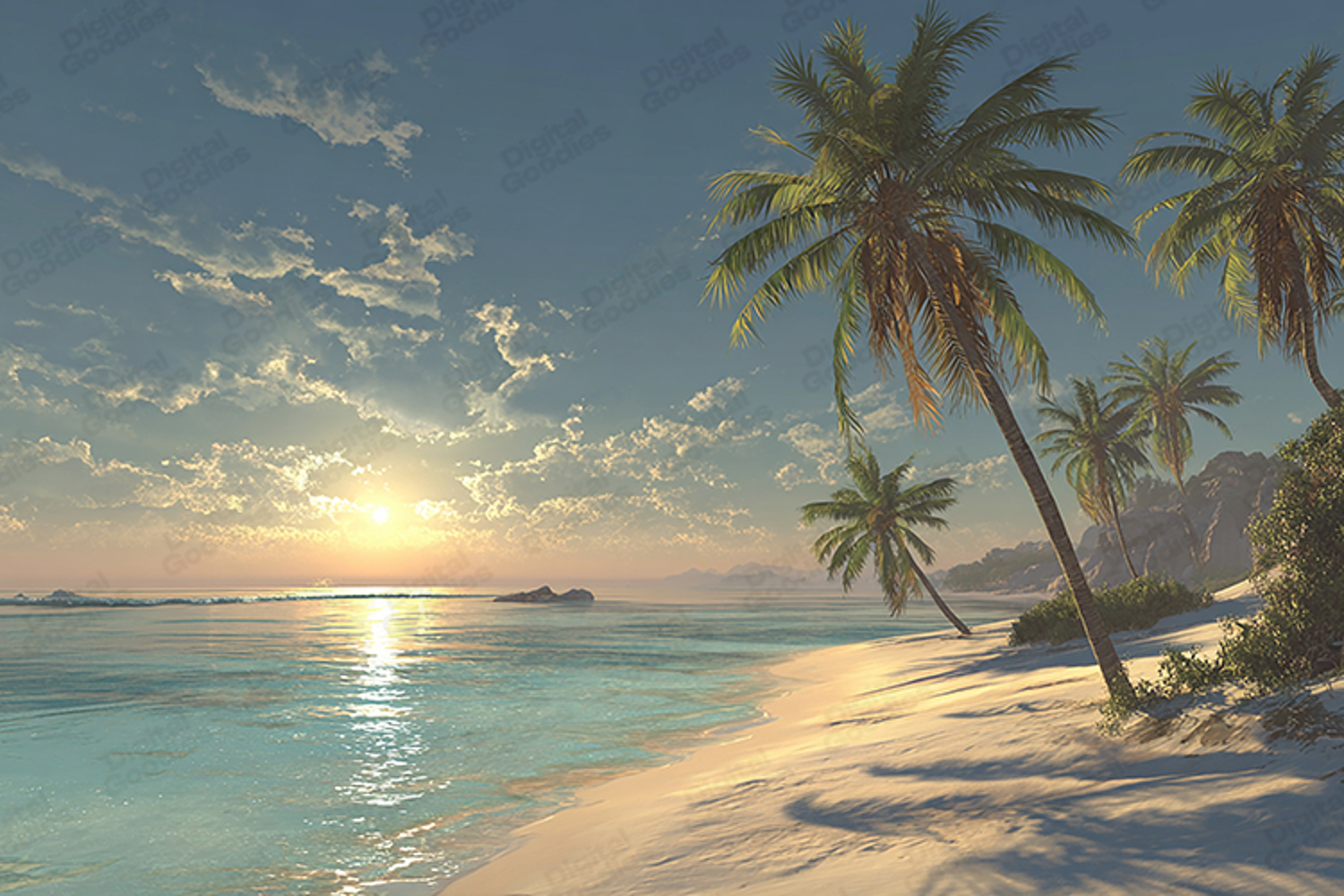 A peaceful tropical beach sunset background featuring golden sunlight, calm ocean waves, and graceful palm trees along the shoreline. Perfect for summer-themed designs, travel graphics, digital papers, posters, and creative artwork. Ideal for scrapbooking, wall art, invitations, branding, and print projects, this tranquil coastal scene adds warmth, beauty, and a relaxing tropical vibe to any composition.