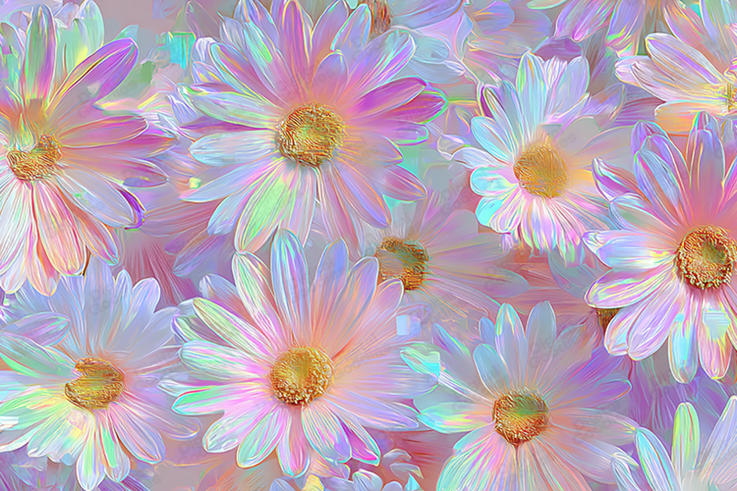 A vibrant holographic daisy floral background featuring pastel iridescent petals, glowing highlights, and a dreamy rainbow sheen. Perfect for digital papers, invitations, spring designs, branding, scrapbooking, craft projects, and aesthetic artwork. This colorful floral texture adds charm, brightness, and a magical holographic touch to any creative project.