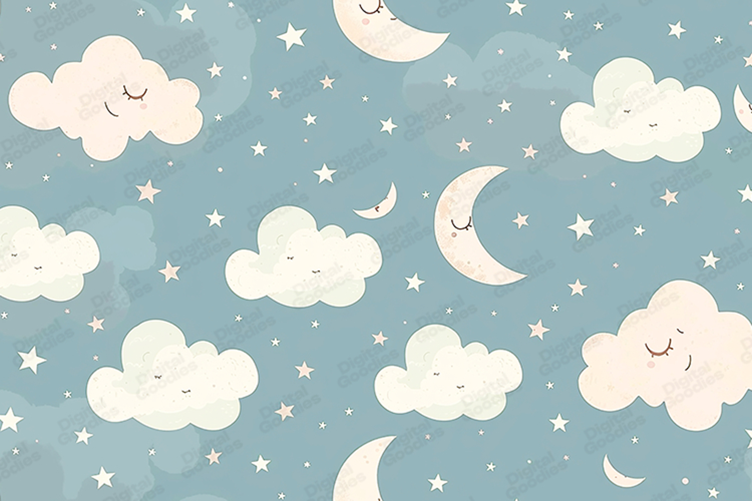 A sweet nursery-style pattern featuring smiling clouds, crescent moons, tiny stars, and soft pastel tones. Perfect for baby shower invitations, nursery decor, kids’ stationery, scrapbooking, wrapping paper, and adorable creative projects. This gentle sky-themed design adds charm, warmth, and a dreamy feel to any artwork.
