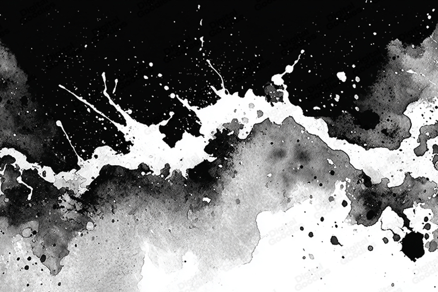 A striking black and white ink splash background featuring dramatic splatters, strong contrast, and expressive watercolor textures. Perfect for digital papers, invitations, posters, branding, scrapbooking, packaging, and creative craft projects. This bold monochrome texture adds an energetic, artistic, and modern feel to any design.