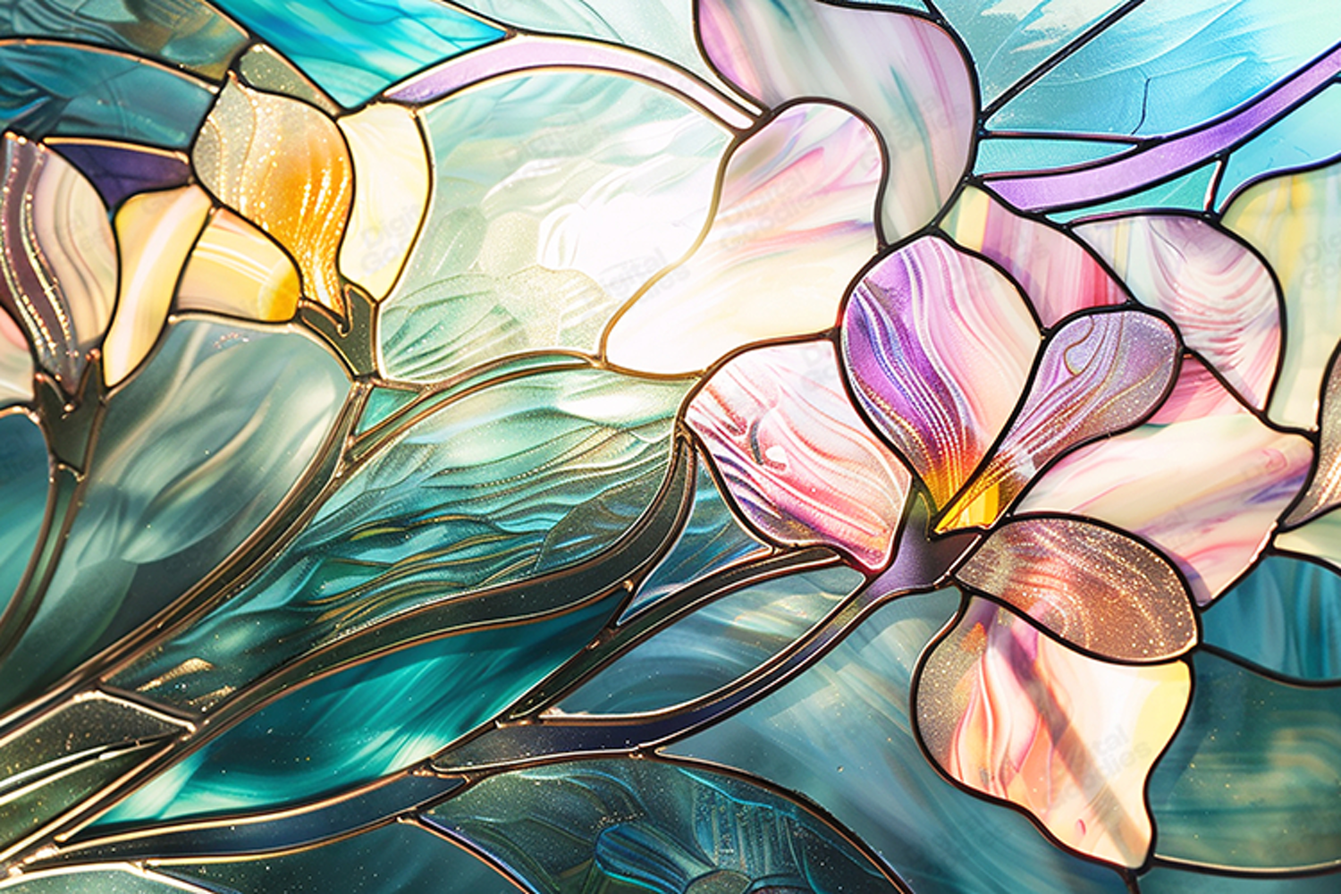 Beautiful stained glass floral background featuring elegant flowing shapes, vibrant pastel colors, and luminous glass textures. This artistic and decorative design is perfect for digital papers, wall art, invitations, branding projects, packaging designs, posters, scrapbooking, and creative print use. The glowing glass effect combined with graceful floral forms creates a refined, elegant, and visually striking background that adds depth, color, and artistic charm to any design.