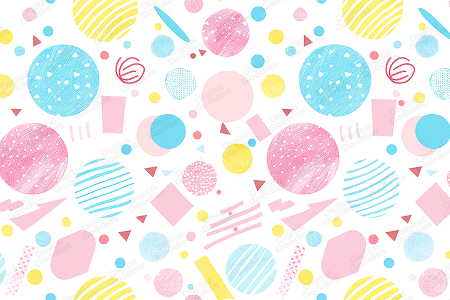 Playful pastel geometric shapes pattern background featuring soft pink, blue, and yellow circles, lines, and abstract elements on a clean white base. This bright and cheerful design is perfect for digital papers, kids projects, nursery decor, branding, stationery, scrapbooking, wrapping paper, invitations, and creative print use. The light color palette and fun geometric layout create a modern, friendly, and eye-catching background ideal for playful, minimalist, and contemporary design themes.
