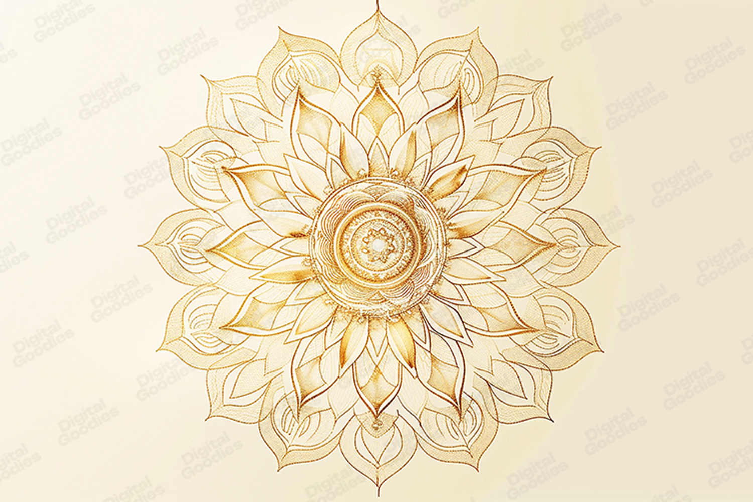 Bring a sense of peace and luxury to your designs with this stunning Golden Lotus Mandala SVG. This intricate piece features radiating layers of delicate lotus petals and geometric patterns, rendered in a beautiful golden hue that adds a high-end, spiritual feel to any project.