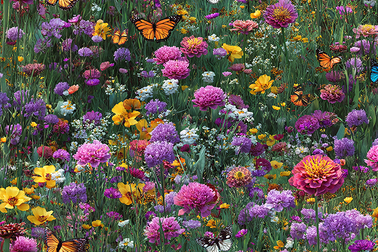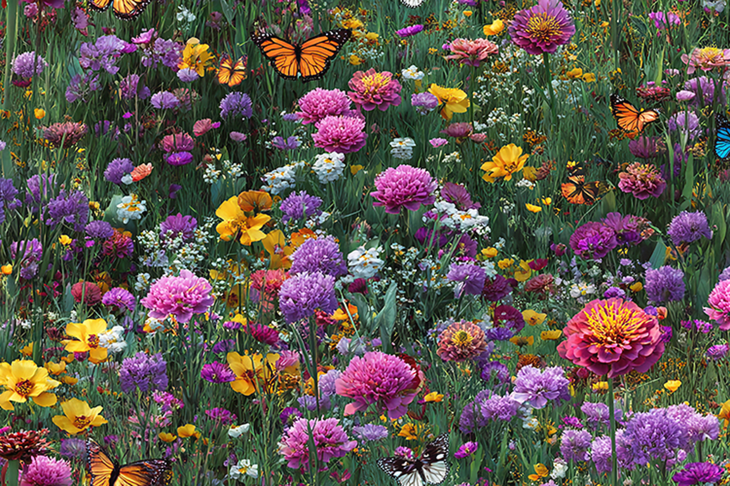A breathtaking and vibrant background featuring a lush meadow filled with colorful wildflowers and fluttering butterflies. This high-resolution texture showcases a dense garden of purple, pink, and yellow blooms, including zinnias and daisies, teeming with life. Perfect for summer-themed crafts, nature-inspired digital scrapbooking, floral wedding invitations, and beautiful sublimation designs, this wildflower landscape brings the serene beauty of a blooming garden to your creative projects.