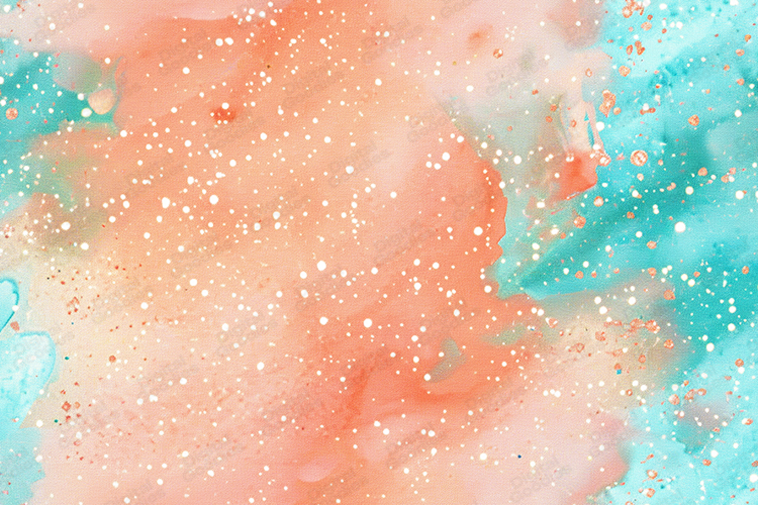 A refreshing and artistic abstract background featuring a soft watercolor wash in warm peach and vibrant teal. This high-resolution texture is accented with delicate white splatters and shimmering copper-toned speckles, creating a modern, airy feel. Perfect for summer wedding invitations, creative branding, digital scrapbooking, and stylish sublimation designs, this coral and blue watercolor backdrop adds a handcrafted, sophisticated touch to any project.