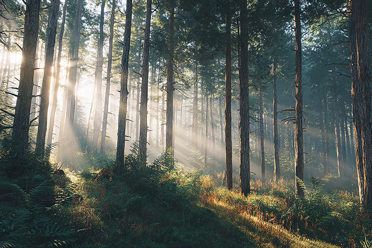 Print Ready Pine Forest Coniferous Forest Enchanted Woods Morning Mist Ethereal Woodland Serene Landscape Forest Floor Texture Sunbeams Background Light Rays Nature