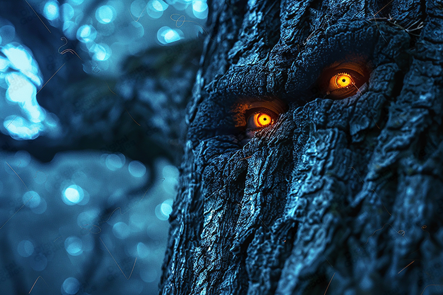 A chilling and cinematic abstract background featuring a malevolent tree spirit peering from ancient, craggy bark. This high-resolution image captures a pair of intense, glowing orange eyes hidden within the deep textures of a weathered tree trunk. Set against a haunting, out-of-focus blue forest backdrop with ethereal bokeh lighting, this design evokes a sense of supernatural dread. Perfect for horror-themed branding, spooky book covers, Halloween digital scrapbooking, and dramatic sublimation projects, this eerie forest guardian adds a powerful touch of dark fantasy to any creative endeavor.