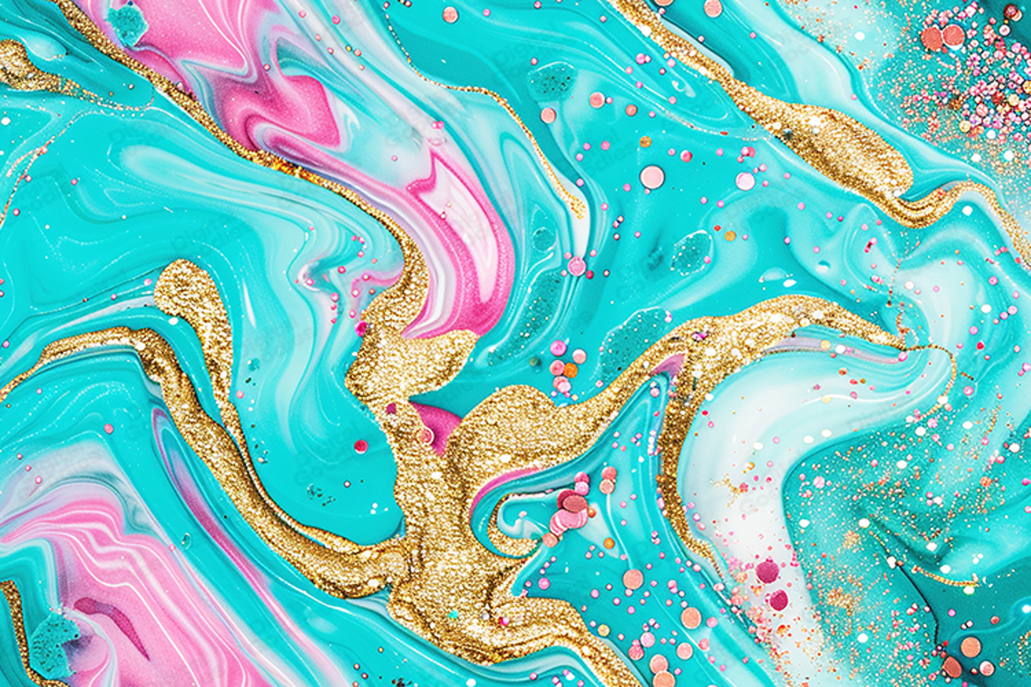 Add a touch of vibrant sophistication to your designs with this high-resolution abstract background. This design features a luxurious liquid marble texture, blending vivid teal and turquoise waves with soft rose pink and magenta swirls. Shimmering paths of golden glitter and delicate metallic speckles flow through the fluid patterns, creating a sense of depth, motion, and modern opulence. Perfect for chic branding, stylish event invitations, high-contrast digital scrapbooking, and trendy sublimation projects, this teal and pink marble backdrop adds a touch of playful glamour and artisanal elegance to any creative project.
