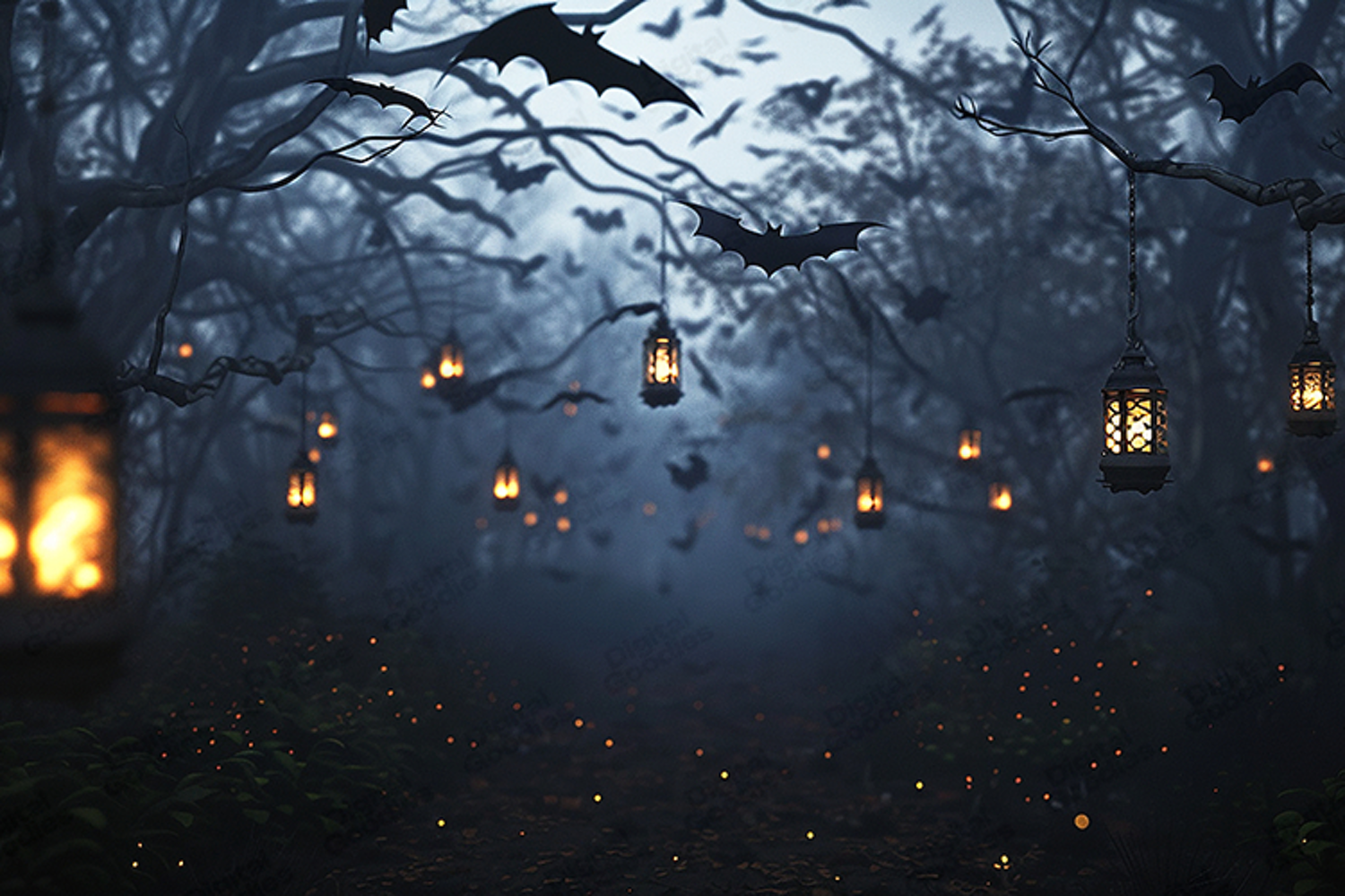 Step into a world of gothic enchantment with this high-resolution haunted forest background. The scene depicts a dark, mist-shrouded woodland path at twilight, where gnarled, leafless branches are silhouetted against a cold blue sky. Numerous vintage lanterns hang from the trees, casting a warm, eerie golden glow that illuminates the swirling fog and distant silhouettes of flying bats. Countless tiny, firefly-like embers dance across the forest floor, adding a magical yet unsettling atmosphere to the landscape. Perfect for Halloween event branding, spooky book covers, atmospheric web banners, and gothic sublimation projects, this cinematic forest scene brings a professional level of eerie sophistication to any creative design.