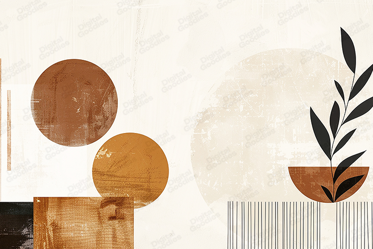 Infuse your designs with a sophisticated, timeless aesthetic using this high-resolution mid-century modern abstract background. This composition features a harmonious blend of geometric and organic elements set against a textured, cream-colored base. The artwork showcases distressed terracotta and ochre circles alongside a minimalist botanical silhouette resting in a bowl-shaped crescent. Fine vertical linework and subtle, gritty textures add a handcrafted, vintage feel to the piece. The earthy palette of sienna, sand, and charcoal creates a warm, grounded atmosphere. Perfect for minimalist branding, boho-chic home decor prints, sophisticated web banners, and modern digital scrapbooking, this balanced composition brings a touch of gallery-quality art to any creative project.