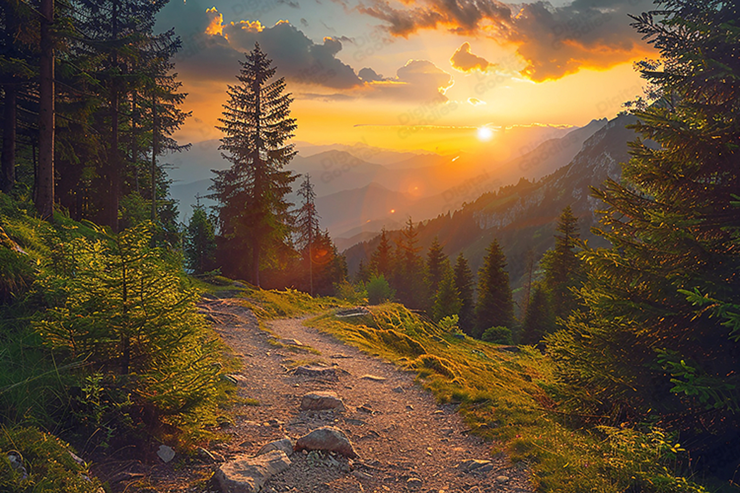 Capture the majestic beauty of the great outdoors with this high-resolution alpine mountain sunset background. The composition features a rugged, stone-lined hiking trail winding through a lush evergreen forest on a steep mountain slope. The artwork is bathed in the warm, golden glow of a setting sun that peeks over distant, hazy peaks, creating brilliant lens flares and sun-drenched highlights across the trees. The dramatic sky is filled with vibrant orange and gold clouds, offering a powerful sense of peace and natural wonder. Perfect for travel-inspired branding, outdoor adventure web banners, serene wall decor, and nature-themed sublimation projects, this breathtaking landscape adds a professional and adventurous atmosphere to any creative design.